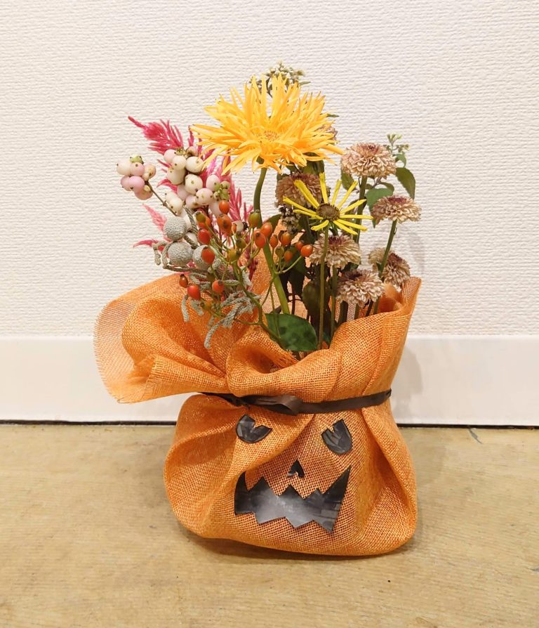 お好きなお花を5本選んで、実もの3種類と共にアレンジしていきます。その後、パンプキン色の布でラッピングし、お顔を作って完成です。