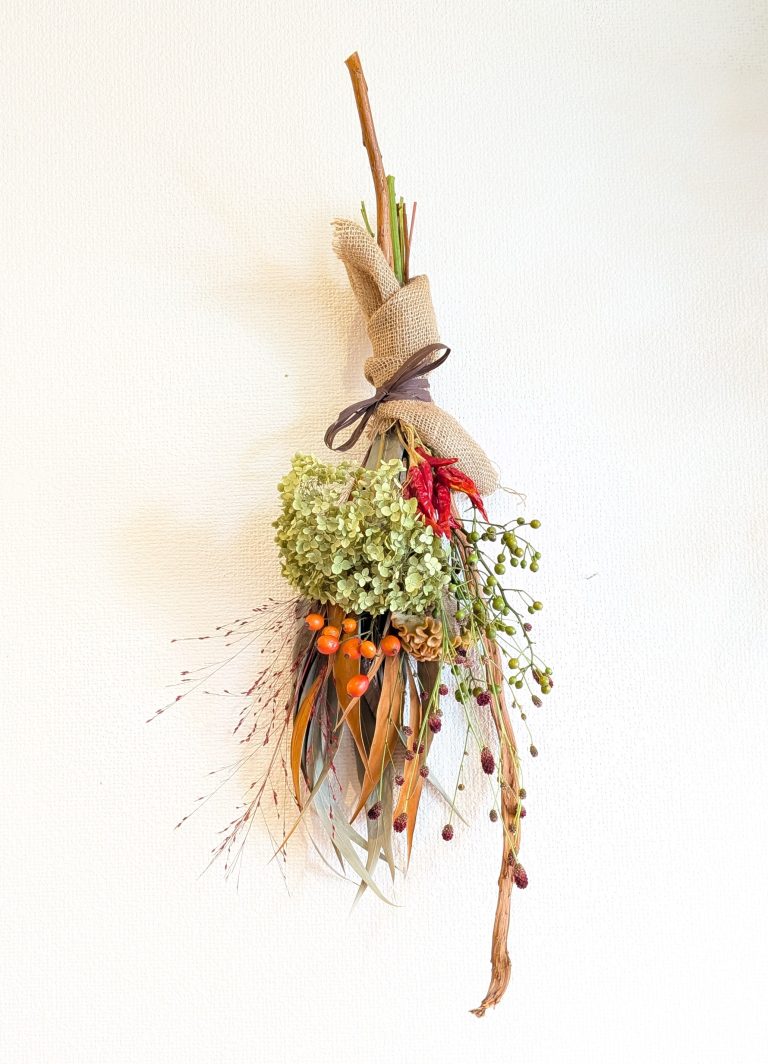 ドライフラワーと生花ミックスでつくる縦長のスワッグです。