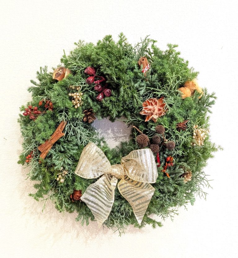 毎年大好評!ヒムロスギやブルーアイスなど数種の家財を使いクラシックなリースを作ります。その後の飾りつけは自分次第。いろいろなオーナメントをご用意しておりますので、好きなものを好きなだけつけて自分だけのリースがつくれます!写真は出来上がりの一例です。