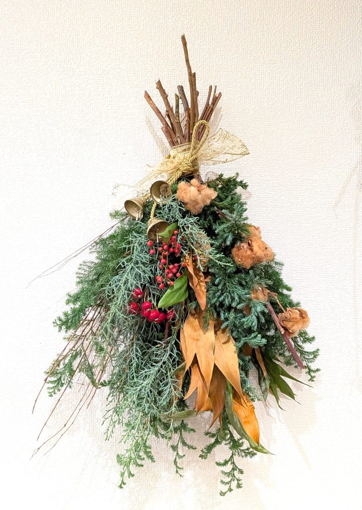 今年のスワッグはベルつき!数種のヒバやコットンなど様々な素材を使って作ります。リボンは選べます。花材は仕入れ状況により変わります。