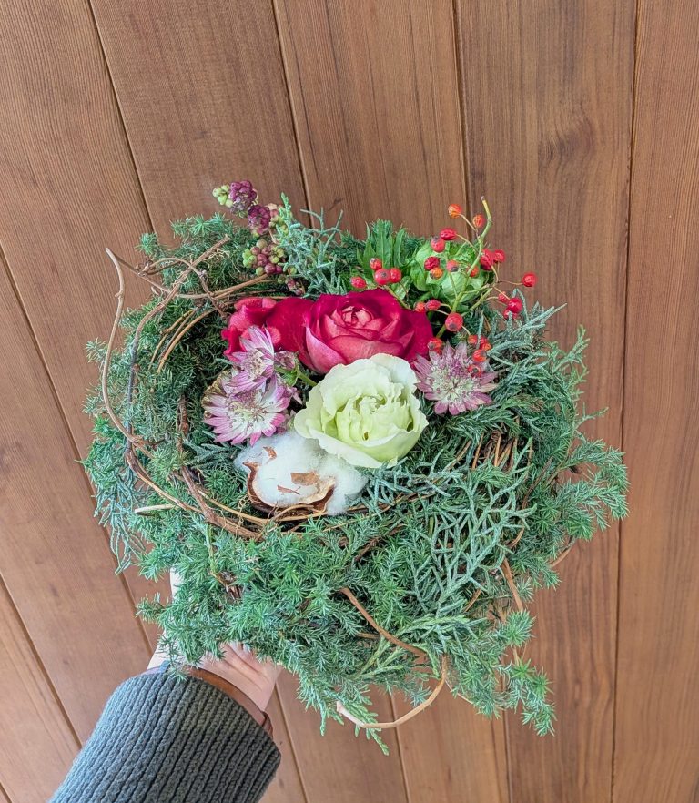 クリスマスの巣を作って中にもちのいいお花をアレンジします。そのままドライにしてもよし!お花が枯れたらネストだけで飾ってもかわいいです。